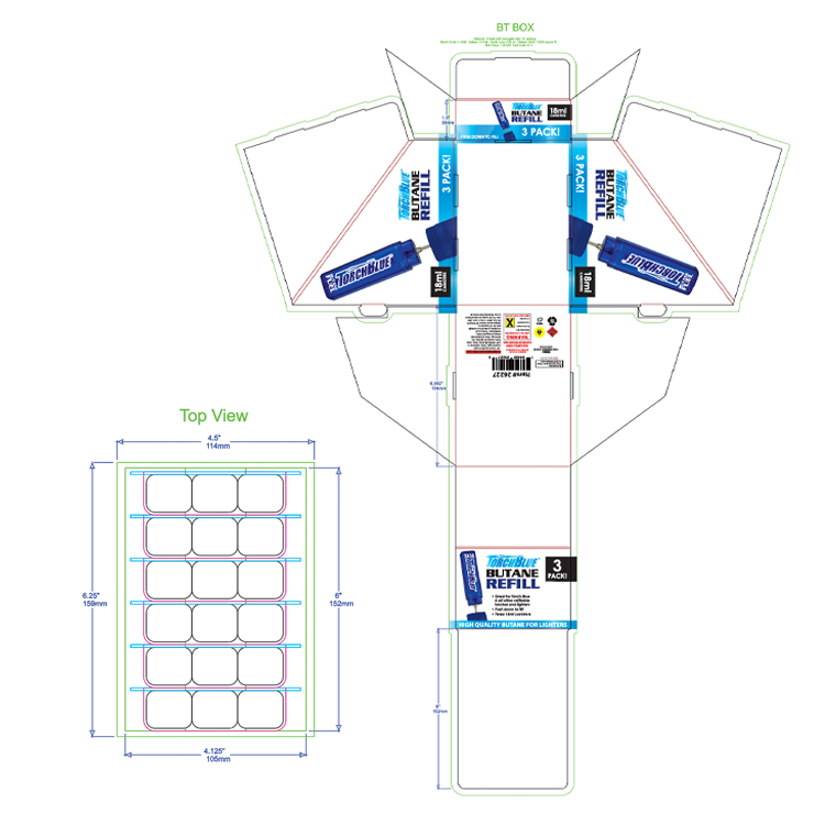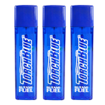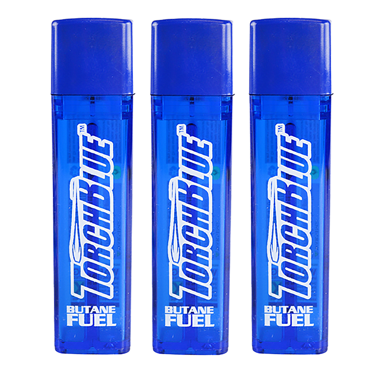 Torch Blue 18ml butane refills can refill any refillable butane lighter. Three pieces per pack, eighteen pieces per display. High quality butane in handy size. Just push up to fill.