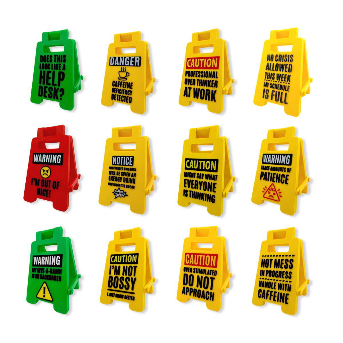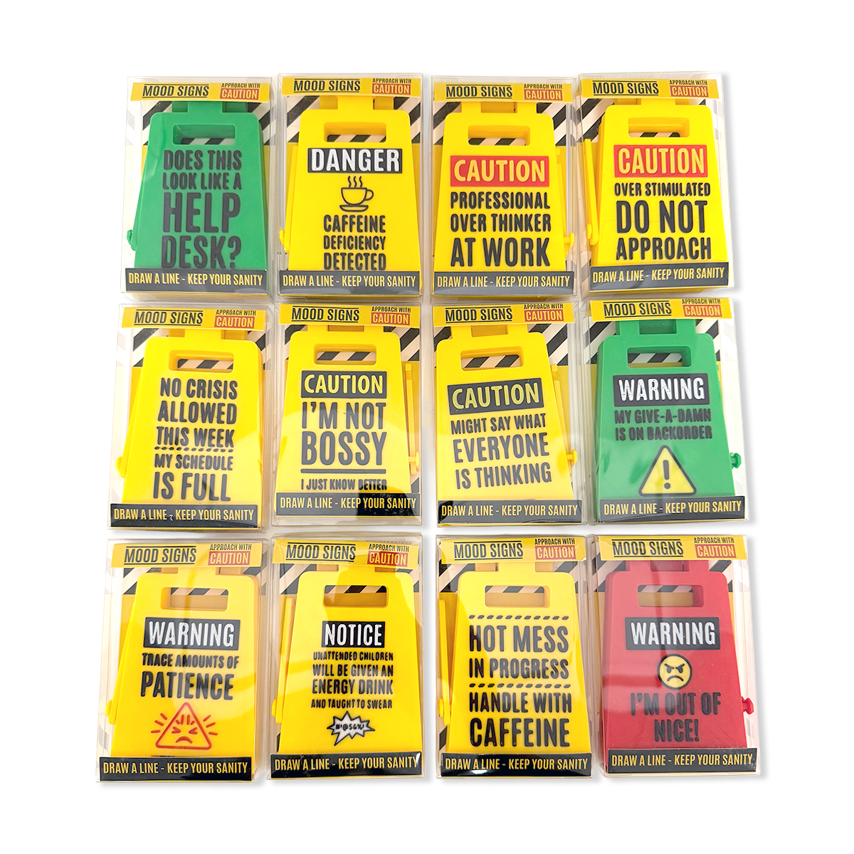 Warning: hilarity ahead! This 2 INCH 3D Standing Mood Caution Sign Assortment delivers cheeky, dimensional signs that humorously flag everything from coffee addiction to Monday blues. Each piece stands independently, making them ideal for desks, shelves, retail displays, and gift baskets. The vibrant designs and witty messaging appeal to office workers, students, and novelty enthusiasts. Comes retail-ready in a display-friendly pack—stock it and watch customers grab them for themselves or as gag gifts. Pure fun in compact form.