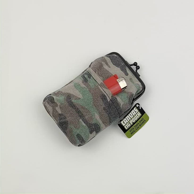 Cigarette pouch made from heavy duty canvas. Fits 100's and regular cig boxes. Includes multi purpose pocket. Assorted designs and colors.