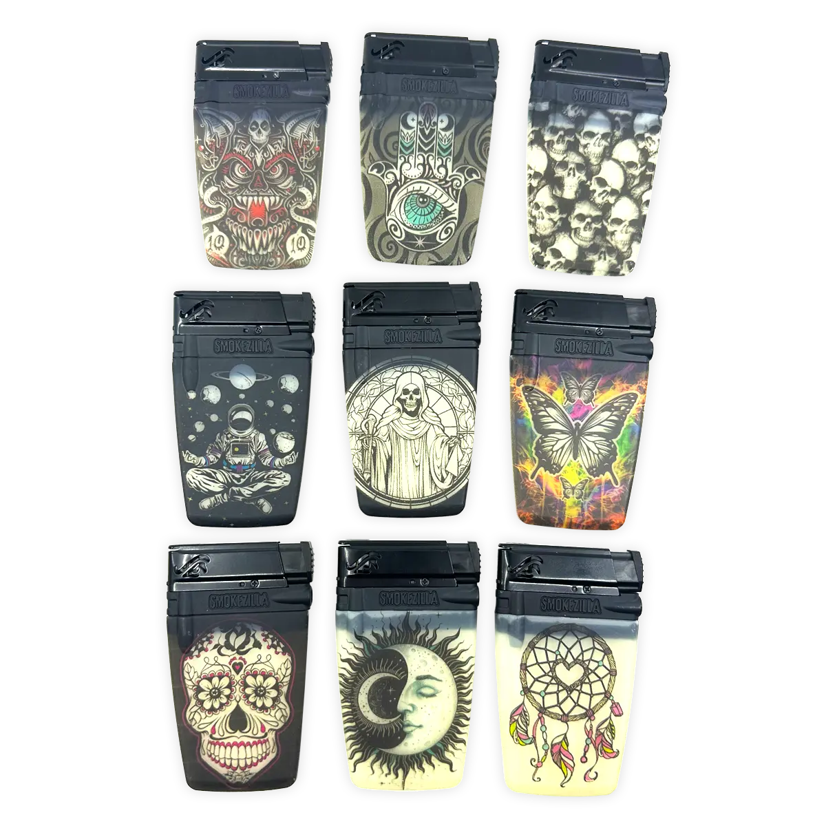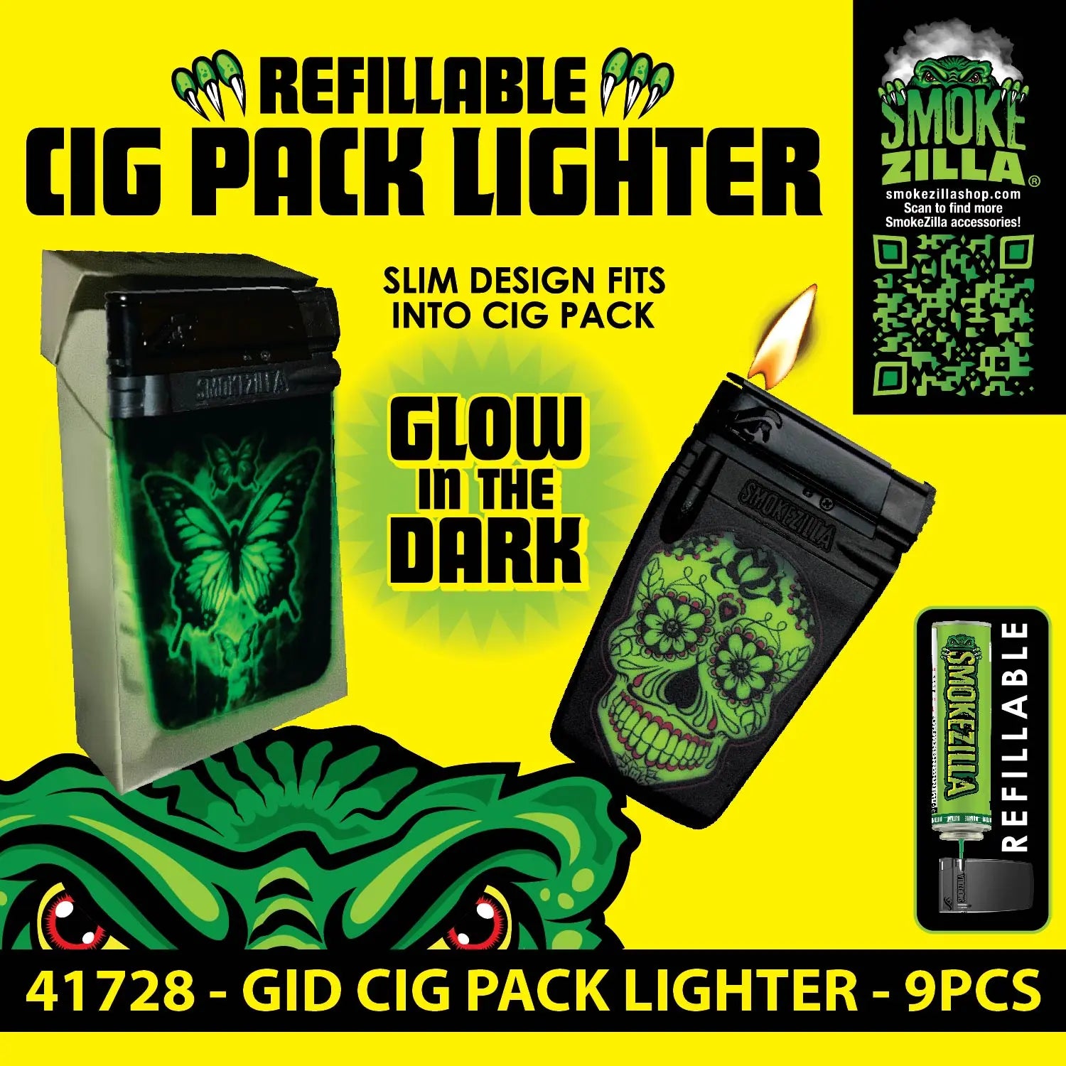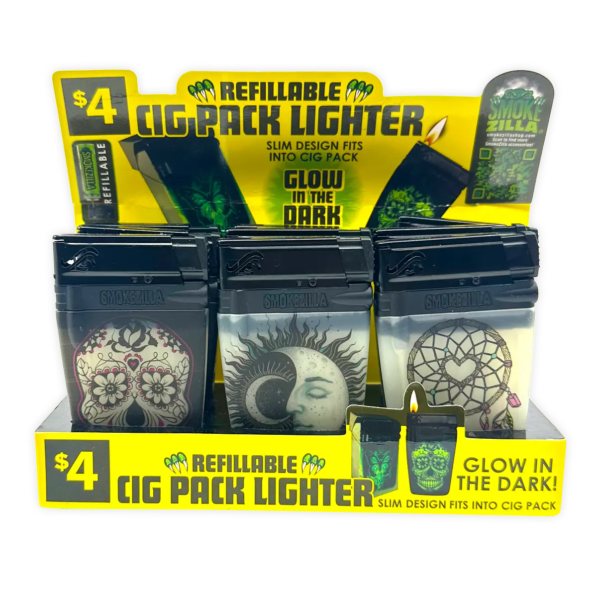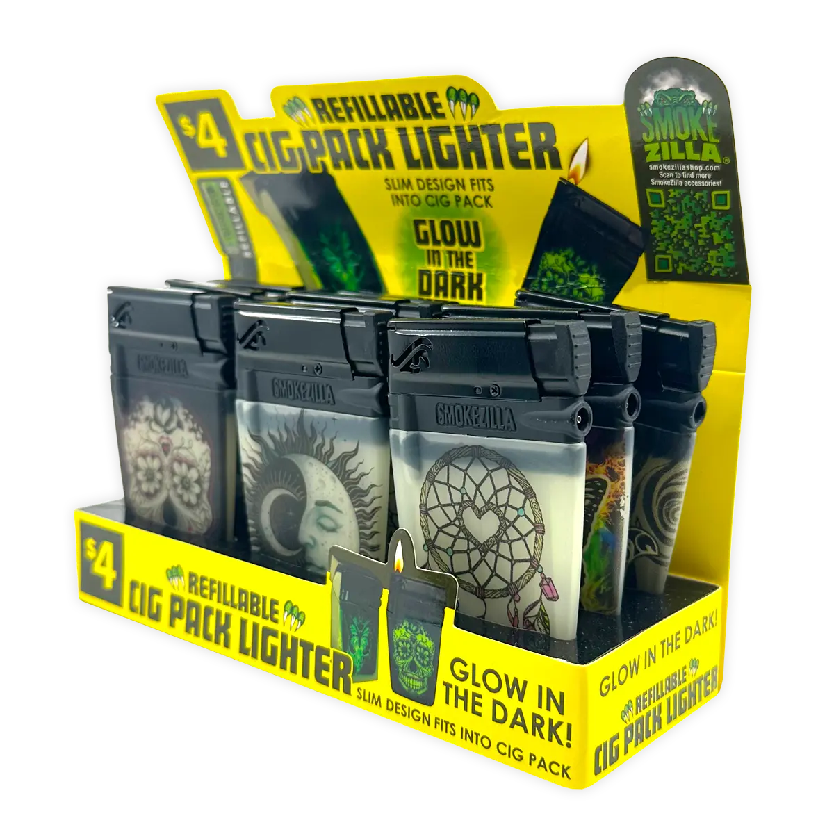 Super thin REFILLABLE lighters designed to fit right in your cigarette pack. Display includes an assortment of slim, sleek glow-in-the-dark designs. Convenience and style combined. These slim, sleek glow-in-the-dark lighters easily fit in your cigarette pack and can be refilled for extended use. Pre-priced @ $4.00.