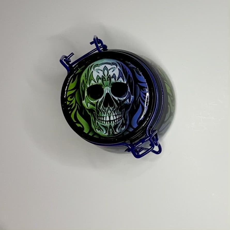 Air tight glass storage jar with metal clasp that locks in odors. Perfect for storing tobacco money and more. Comes in a variety of designs and colors.