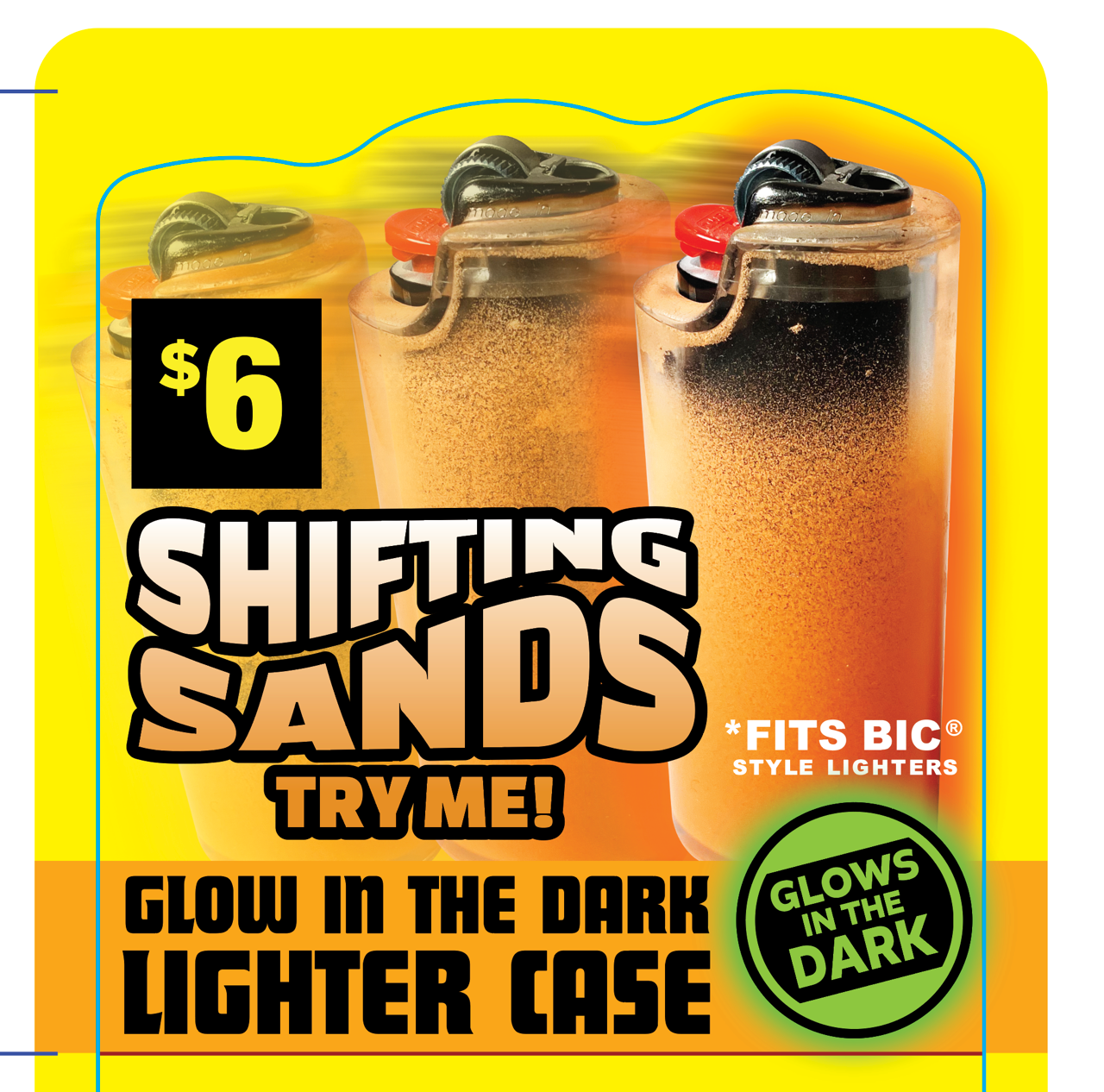 Enhance your BIC® style lighter with this glow-in-the-dark case that features shifting sand inside. Simply turn the lighter case upside down to watch the sand flow, creating a captivating visual effect. Its glow-in-the-dark design ensures you can easily find your lighter even in low light.