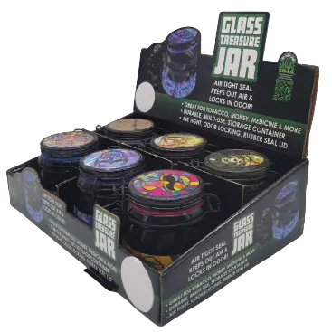Air tight glass storage jar with metal clasp that locks in odors. Perfect for storing tobacco money and more. Comes in a variety of designs and colors.