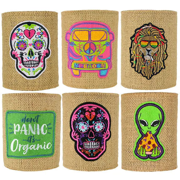 Can Cooler made from all natural hemp. 5mm thick neoprene holds standard cans. Non-skid rubber bottom and reinforced seams for durability. Includes assorted patches on front.