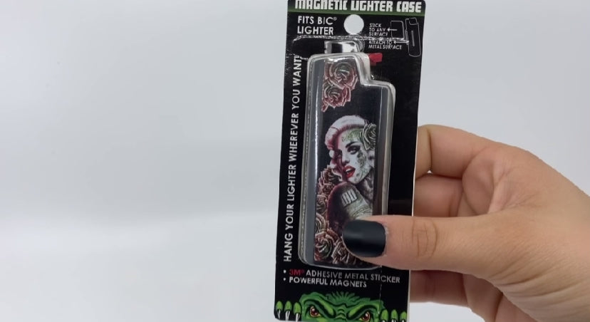 Store your lighter anywhere you want with our Magnetic Lighter Case – featuring 3M® Metal Adhesive Sticker and powerful magnets! Variety of styles included in each display. Actual dimension of lighter case without packaging is 3.25" x 1.25" x .75".