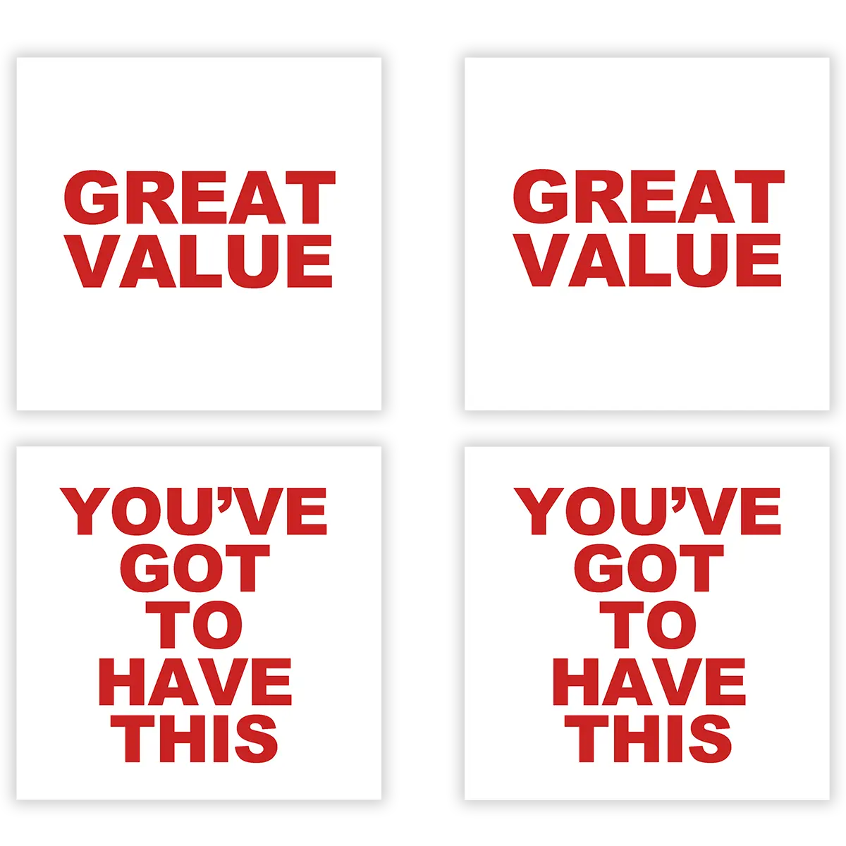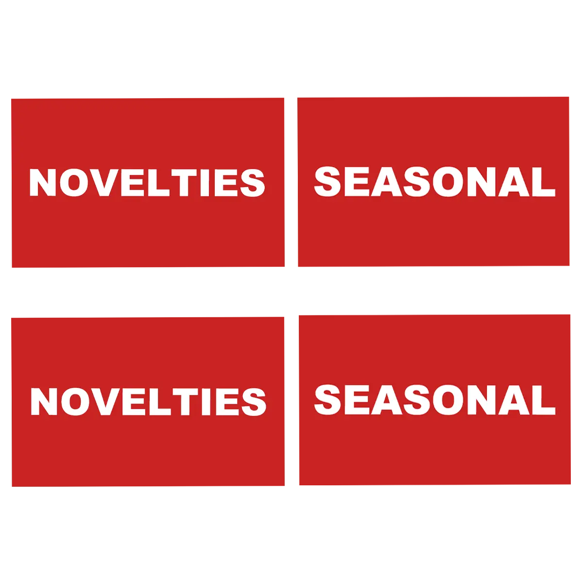 This signage comes with two(2) "Great Value" Signs, two(2) "You've Got To Have This" Signs, two(2) "Seasonal" Signs, and two(2) "Novelties" Signs.