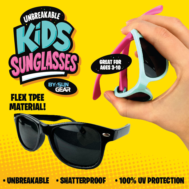 These unbreakable kids' sunglasses are built for adventure! Made from flexible TPEE material, they bend and flex without breaking, making them practically indestructible for active play. The shatterproof design means no worries about damage during backyard fun or outdoor explorations. With 100% UV protection, your child's eyes stay shielded from harmful rays while they enjoy the sunshine. Ideal for ages 3-10, these tough little shades are the perfect companion for every sunny day adventure!