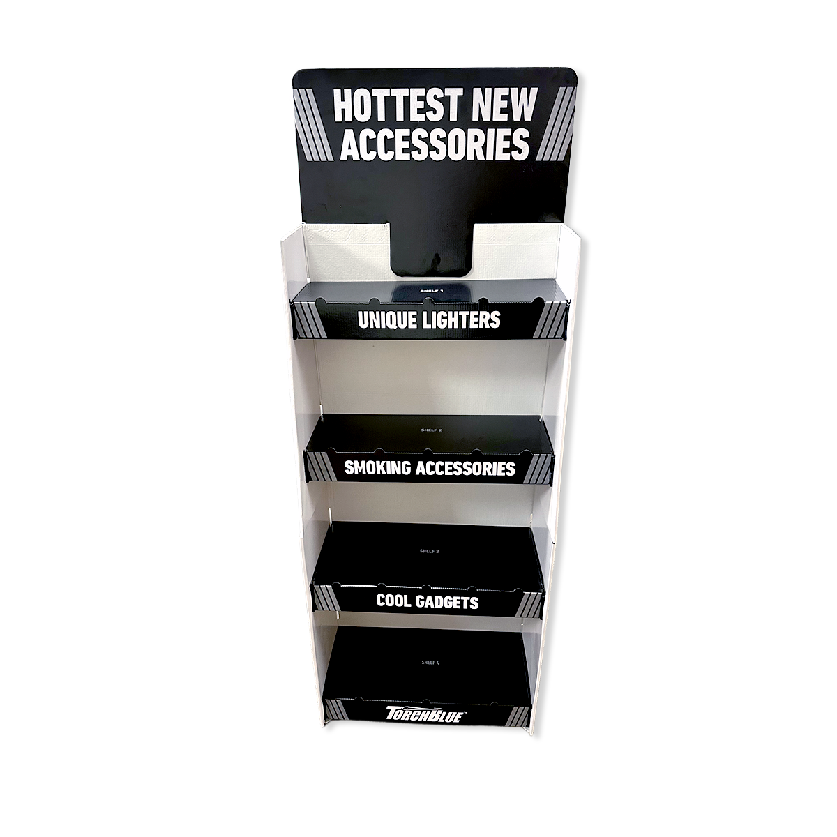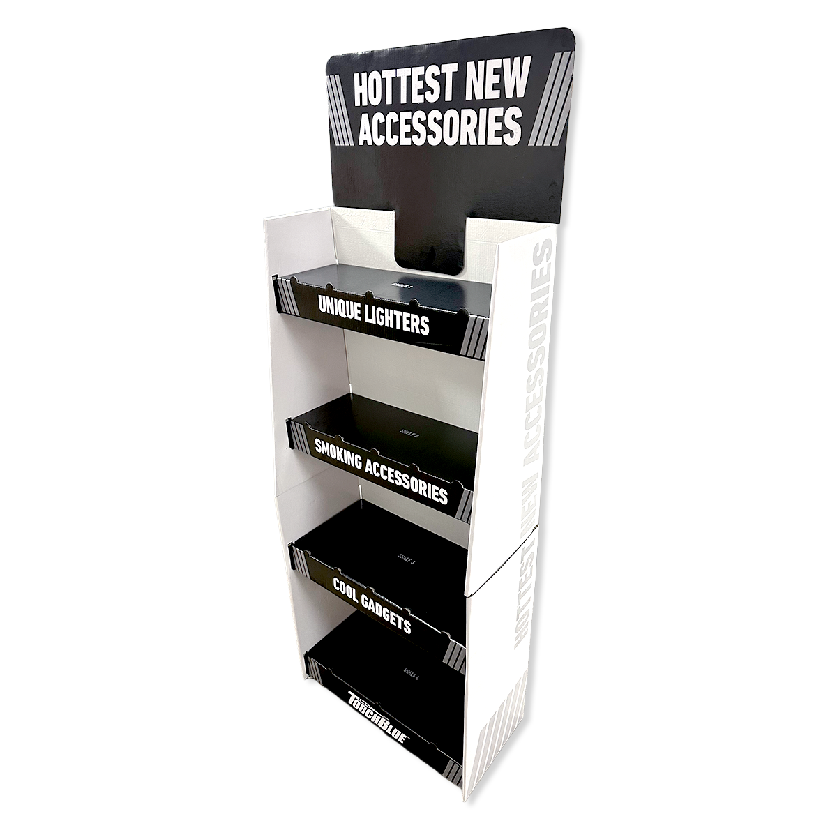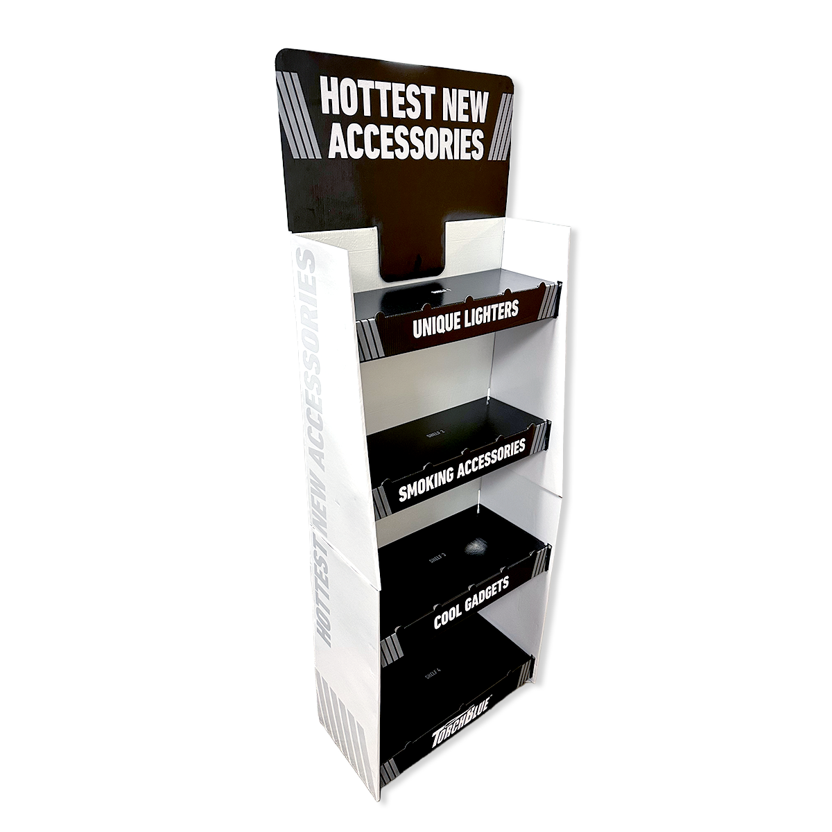 Our Smokezilla Corrugated Display showcases a variety of impulse products within a floor display that cannot be ignored.Shelves feature pre-priced product sections.