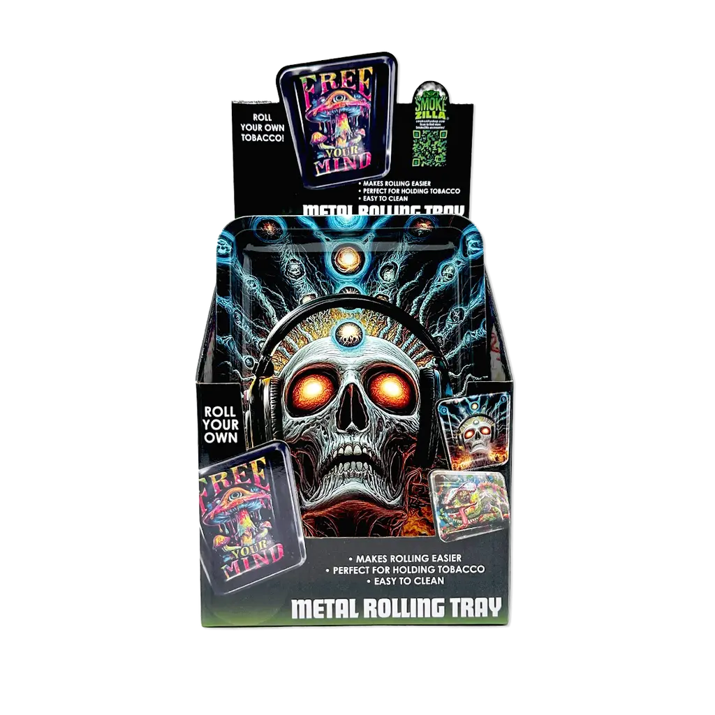 Add some style to your smoking routine with our Metal Roll Tray! Each retail ready display comes with a variety of eye-catching designs. Perfect for rolling cigarettes or storing your small essentials. Don't miss out on this fun and functional product!