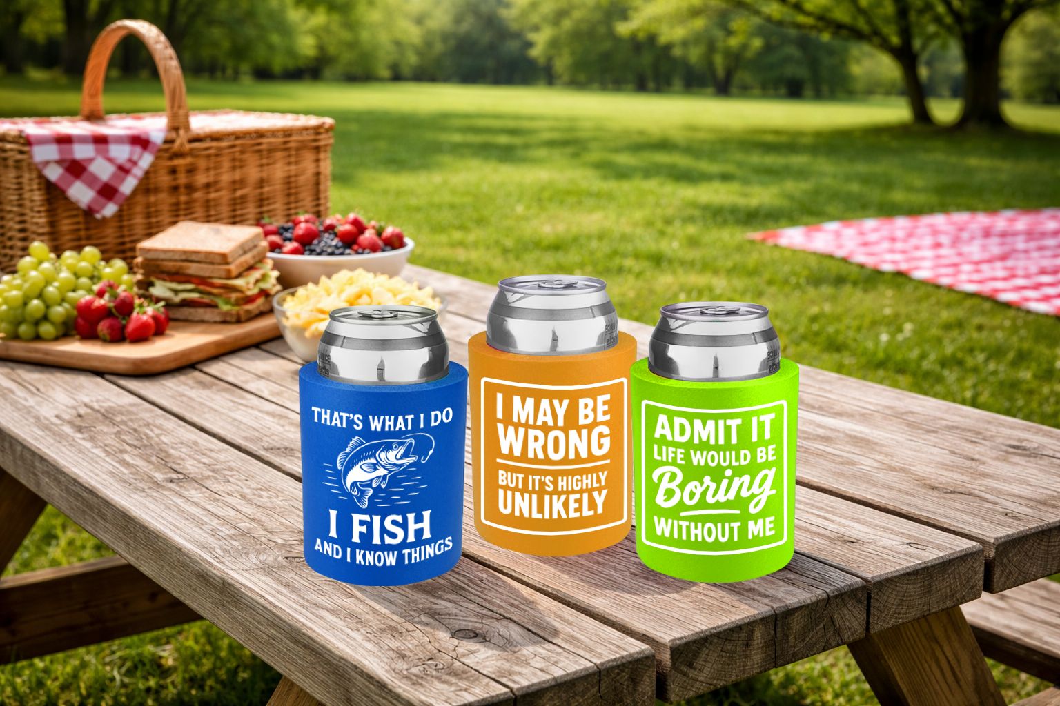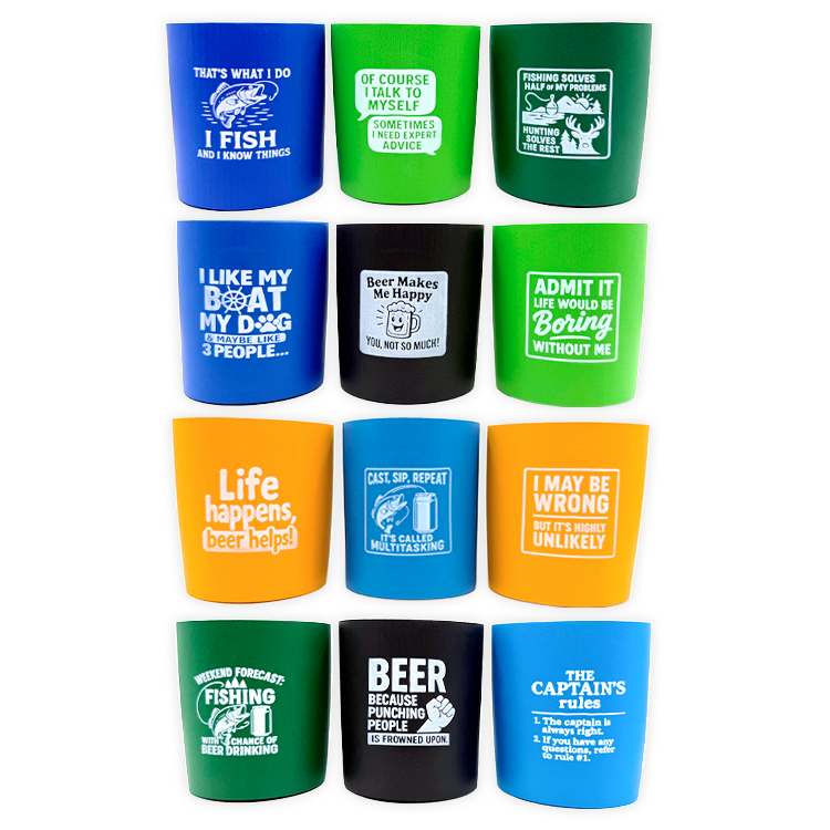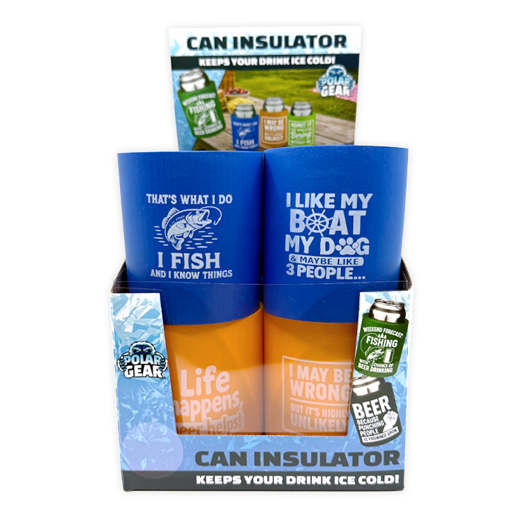 Polar Gear Foam Can Insulators deliver reliable beverage temperature control in a versatile assortment designed for retail display. Features vibrant foam colors—neon orange, blue, black, neon green, green, and light blue. Each insulator showcases a unique saying printed in single-color design for maximum visual impact. Ideal for wholesale distribution, gift retailers, and novelty channels seeking high-margin, quick-turn merchandise with strong consumer appeal.
