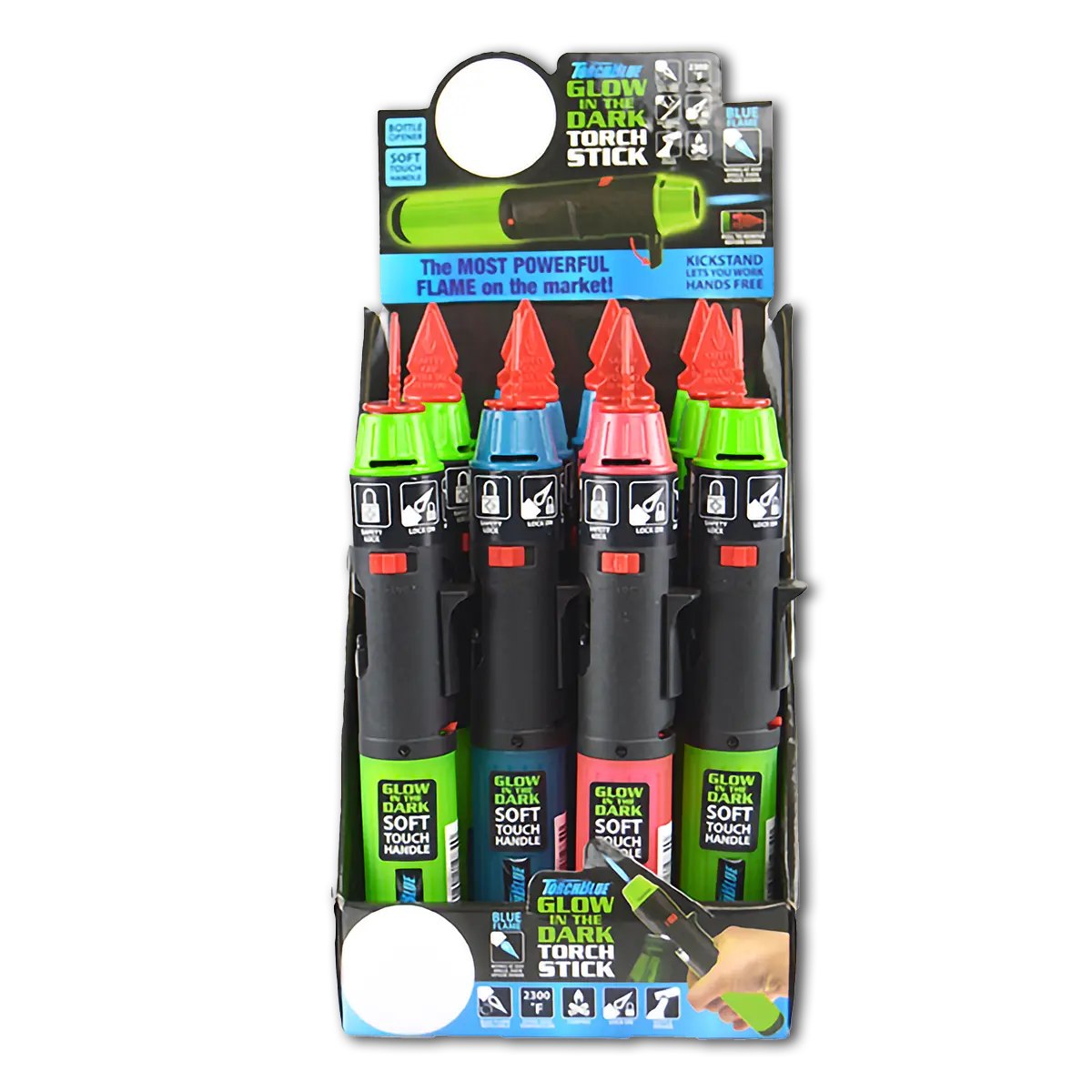 This Glow in the Dark Torch Stick features 2300 degree flame that can be used for multiple tasks. Includes kickstand, bottle opener, lock on feature and safety lock. The perfect torch for just about any project.